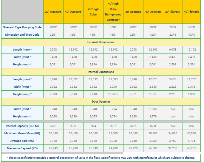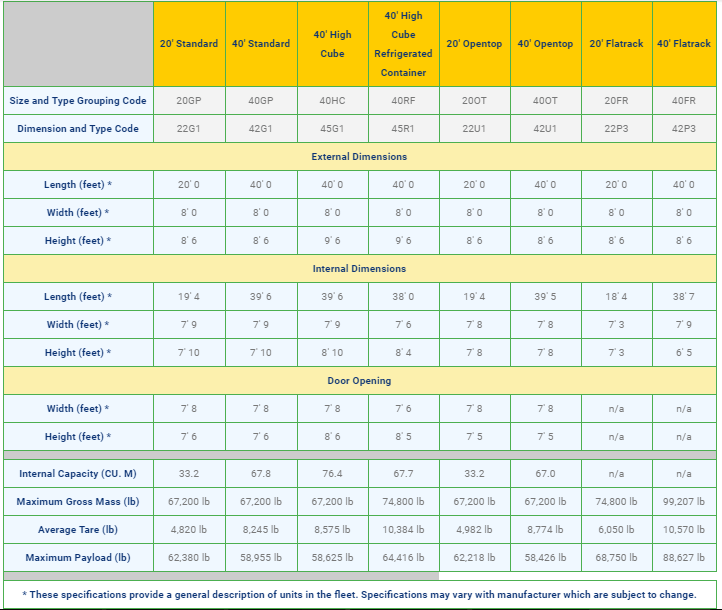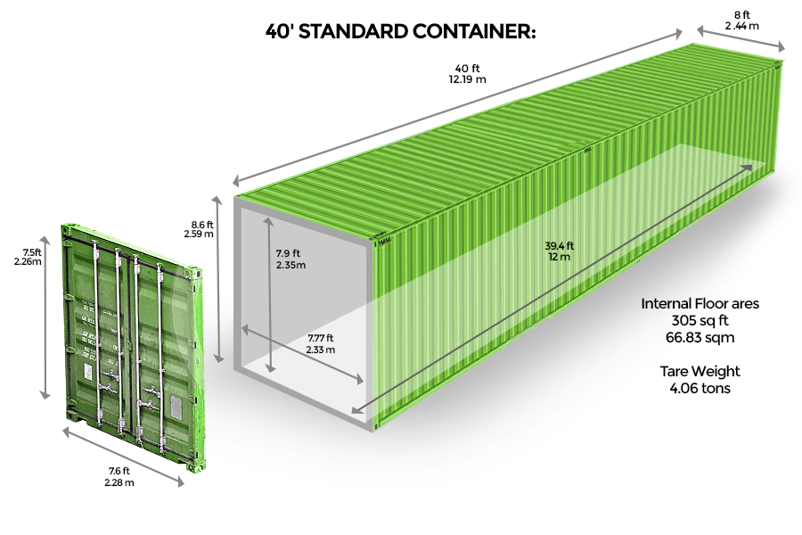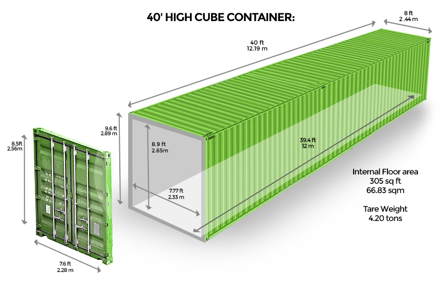 These dimensions are 20 ft., 40 ft., 45 ft., and forty-five ft. high. The 40 ft. container